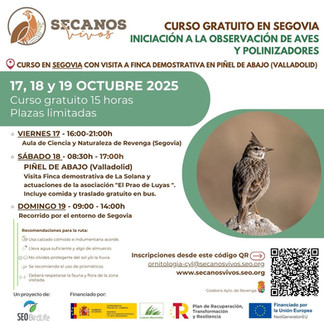 Una vez más, SECANOS VIVOS que organiza SEO Birdlife, ha contado con nosotros para llevar a cabo uno de los cursos gratuitos de iniciación a la observación de aves y polinizadores con el objetivo de formar, dar a conocer este gran proyecto y visitar una de las fincas demostrativas que promueven la salud y la biodiversidad.